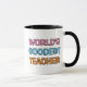A charming, colourful mug suitable for coffee, tea, hot chocolate, milk, or juice, featuring the humorously intentional misspelling "WORLDS GOODEST TEACHER" in vivid, bold colours. It's a delightful present to offer your child's teacher as a sign of gratitude for imparting lessons in correct spelling and grammar.