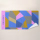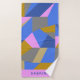 This fun geometric abstraction bath towel set features colourful geometrical shapes in a bold colour palette of blue, pink, and gold, personalised with your name.