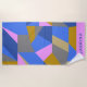 This fun geometric abstraction beach towel features colourful geometrical shapes in a bold colour palette of blue, pink, and gold, personalised with your name.