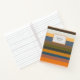 This notebook design features colourful retro inspired geometric design with stripes in a warm colour palette. Customise this journal with your own name or text of choice on the label.
