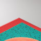A vivid composition of various geometric shapes set against a red backdrop. The arrangement shows spheres, rectangles, and triangles in bright, contrasting colours.