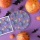 Design with fun Halloween characters. Funny ghosts on purple. Dress up your table with this fun design. See the entire collection. Ideal for children's fall parties.
