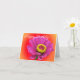 Pink zinnia with colourful background, with Happy Birthday in script.