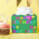 Rainbow Happy Birthday balloons with bold text on green.