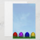 Happy Easter illustration featuring colourful painted Easter eggs in the grass with the blue sky in the back.