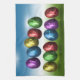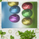 Modern colourful Easter illustration featuring metalic style foil wrapped coloured Easter eggs with "Happy Easter" lettering on a spring sky background.