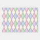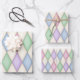 This wrapping paper has an elegant Harlequin pattern on pastel blue, purple, green, pink, and cream diamonds in three different sizes.