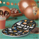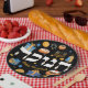 Colourful Hebrew Hanukkah Dreidel Menorah & Doughnuts on dramatic black background. These colourful plates are the perfect way to set a festive Hanukkah/Chanukah Party table. Delight your guests...Whimsical colourful Chanukah elements — including Jelly Doughnuts, Dreidels, Wrapped Gifts, Gold Coins and Stars— surround the word CHANUKAH in Hebrew. If you would like to see a different version of this design- email us at: bestdressedbread@gmail.com. We LOVE to Collaborate. Happy Chanukah!