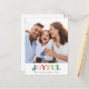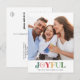 This colourful joyful Christmas portrait photo holiday postcard makes the perfect modern holiday greeting. The simple design features cute and fun typography with alternating coloured letters in red, blush pink, emerald green, pastel green and yellow gold. Add your family picture and personalise the postcard with your family name, year, personal greeting, and names.