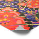 An intricate geometric pattern with a kaleidoscope effect features vibrant colours like orange, pink, and blue. Symmetrical shapes create a mesmerising, hypnotic design.
