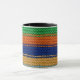 Multi-coloured knitted stripes in green, red, orange, light blue, yellow and dark blue, wool texture. Photography.
