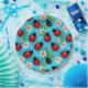 A seamless pattern featuring red ladybugs and pink flowers against a bright blue background. Perfect for fabric designs, wallpapers, and nature-themed decorations. Vibrant and cheerful design for diverse uses.