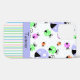 Pretty iPhone case with whimsical graphics of colourful ladybugs and blue polka dots, on a white background. A pastel striped pattern decorates the bottom of the case, with a light blue band, as a border between the two backgrounds. Black text, on the band, is fully customisable to suit your needs. Great gift idea.