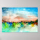A print that depicts an abstract watercolor painting of blue, green, and peach tones.
