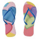 Colourful painting of hearts, layered in a lighter or darker shade, is printed on custom flip flops. The left and the right shoe each has their own unique look. Very trendy.