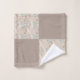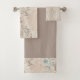 The towel set features a neutral colour palette with shades of beige, brown, and hints of pink and blue in the floral pattern.
