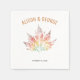 Colourful leaf print burnt orange autumn wedding paper napkin. A lovely design that features a fall leaf print and your names and date of wedding. Colours: dark brown, red, orange and green.
