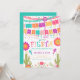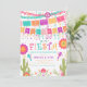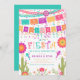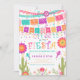Colourful let's fiesta engagement party invitation featuring bunting flags, flowers, confetti & cactus plants