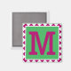 The capital letter 'M' is done in a fuchsia-colour on a bright green background. The border picks up on the fuchsia-colour of the letter and has a diamond-shape design all around the edge in fuchsia and white.