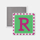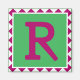 The capital letter 'R' is done in a fuchsia-colour on a bright green background. The border picks up on the fuchsia-colour of the letter and has a diamond-shape design all around the edge in fuchsia and white.