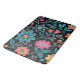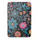This seamless pattern features a variety of colourful flowers and leaves on a dark background. The flowers are in a variety of colours, including red, orange, yellow, pink, purple, and blue. The leaves are blue and grey.