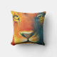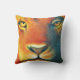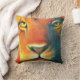 A pillow with an oil painting digital image of a close up of a lions face, with piercing