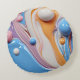 A close-up of a colourful, frothy liquid with small, round bubbles floating on the surface. The liquid is a vibrant blue with hints of pink and purple.