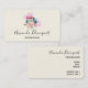 Business cards with a delightful image. 3 colourful macarons, pink, green and blue with a fancy rose floral bouquet and a splash of pink watercolor behind. Delicious and stylish too!