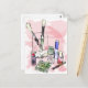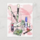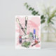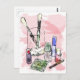 A one of a kind postcard of a colourful makeup illustration with a pink splatter paint background.