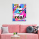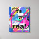 This is a very colourful, abstract, maximalist design art work that questions what is real. Maximalist design is predicated on the theory that more is more. Sometimes in this society we are bombarded by so much information, it's hard to tell what is real or fake, truth or lies. We look deeper only to be inundated with more of the same. Where are we going as a society is a good question. The print is on quality stretched canvas with bright royal blue around each of the canvas sides. Geometric shapes and gradient spheres intermingle with bold text to bring focus to the central image of the eye. I think I will name the piece simply, "What's Real?"
