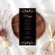 Create a captivating dining experience with our "Colourful Mexican Floral Fiesta Wedding Menu Card" against a striking black backdrop. This menu card showcases vibrant hand-painted watercolor flowers in shades of orange, red, and purple, embodying the vivacious spirit of Mexico. The elegant dark text stands out against the bold background, presenting your curated menu offerings with sophistication. Elevate the ambiance of your wedding reception with this chic and festive menu card, combining visual allure and functionality for a memorable celebration.