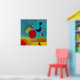 This whimsical abstract graphic features the colours red, yellow and shades of blue.