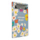 A scatter of modern, illustrated flowers in bold and feminine colours of ivory, yellow, orange, violet and teal pop against a dusty blue background making this clipboard an ideal accessory for taking notes, school and work. Personalise the two coordinating coloured text boxes on the front with a name or school subject.