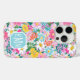 Customise this gorgeous modern colourful flower garden of flowers in pink, blue, orange, yellow and white iPhone 15 pro case with your your initials in a modern CAP font in white on blue. It's so vibrant and happy!