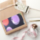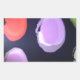This artwork features a collection of overlapping circles, or "polka dots," in varying sizes and colours set against a dark background. The arrangement of the dots is somewhat random, creating a sense of playful spontaneity. A soft purple border frames the composition, adding a gentle touch to the overall design.