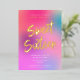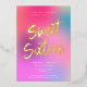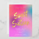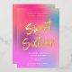 This modern Sweet Sixteen birthday party invite features a colourful gradient background in shades of pink, aqua, and purple with modern brush script in raised gold foil and modern typography. The brush script greeting says "Sweet Sixteen". The gradient background can be removed and replaced with a solid colour if you prefer. You can also add a photo to the back! Just click on "customise design" in the personalisation drop-down menu.