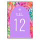 Colourful Modern Tropical Watercolor Floral Wedding Table Numbers features colourful watercolor tropical flowers in pink, purple, orange, green and turquoise. Add your custom table number in elegant white calligraphy script typography. Personalise by editing the text in the text boxes. Designed for you by Evco Studio www.zazzle.com/store/evcostudio