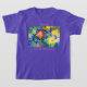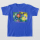 Colour My World Pretty on a colourful girl's Tee shirt. This multicolored girl's top features a blue koi pond made of colourful mosaic tiles dappled in sunlight and shadow. A trio of green koi fish in a corner appear to have stopped to smell the red, yellow and pink flowers. Customise with your choice of colour t-shirt and personalise with Your girl's name.