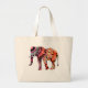 A colourful abstract patterned elephant illustration. The elephant has orange purple and blue colours with circles, wavy lines and other shapes making up this eastern flavoued psychedelic design.