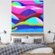 Colourful abstract landscape of hills and an ocean in colours of pink, purple, blue, green, and cyan.