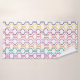 This towel set has an orange washcloth, a yellow hand towel, and a bath towel with an art deco design of orange, turquoise, pink, blue, purple, and yellow half circles connect with lines on a field of white.