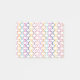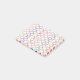 This Post-It notepad has an art deco design of orange, turquoise, pink, blue, purple, and yellow half circles connect with lines on a field of white.