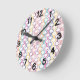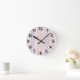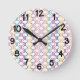 This all clock has an art deco design of orange, turquoise, pink, blue, purple, and yellow half circles connect with lines on a field of white.