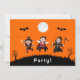 Party invitation shows three happy, jumping children dressed in Halloween costumes as a witch, vampire, and grim reaper. Cute bats fly near a white moon. Two-sided. Customise or personalise all text. The background is a Halloween orange. One product in a party suite. Cute, fun, joyful design for the holiday.