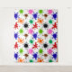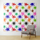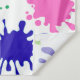 White background with black, blue, red, green, orange and brown paint splatters pattern.