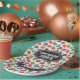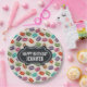 Personalised birthday plates with a cute pattern of macarons in many different colours with a faint polka dot pattern behind.