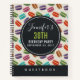 Personalised birthday party guest book with a cute pattern of macarons in many different colours with a faint polka dot pattern behind. A black circle with your personalised text inside layered over top the pattern.