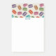 Sticky notes with a cute pattern of macarons in many different colours with a faint polka dot pattern behind.