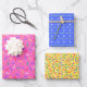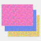 A fun collection of wrapping paper to have on hand. Includes: Rainbow sprinkles on pink background, Diamond and dot pattern on blue background and a Festive Rainbow confetti on a yellow background.