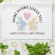 This design features silhouettes of bunnies (blue & yellow, pink & green) and a heart. The simple animal design with personalised text makes a cute modern and unique kitchen towel - SOME BUNNY LOVES YOU | HAPPY EASTER, HAPPY SPRING!